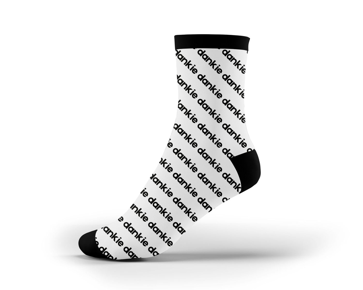 Wys jou waardering met elke tree! Hierdie wit sokkie met swart “dankie”-patroon en kontrasterende toon, hak en bo-rand bring speelse styl en gemak bymekaar. Gemaak van ’n sagte katoen-polyester mengsel vir asemendheid, duursaamheid en ’n gemaklike pasvorm wat die hele dag hou.